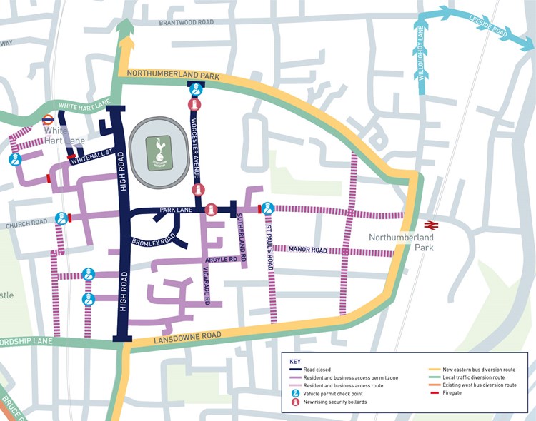 Love Lane and Whitehall Street also have all parking bays suspended on a matchday and are closed for up to one and half hours after a match to cater for queues at White Hart Lane station.